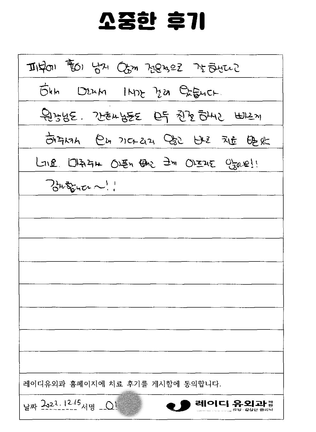 피부혹클리닉 이00님께서 작성해 주신 피부혹 수술 후기입니다. 페이지 정보 작성자 레이디유 댓글 0건 조회7회 작성일 23-10-20 08:51 . 목록 이전글임00님께서 작성해 주신 피지낭종 수술 후기입니다. 23.10.20 다음글김00님께서 작성해 주신 피부혹 수술 후기입니다. 23.10.20