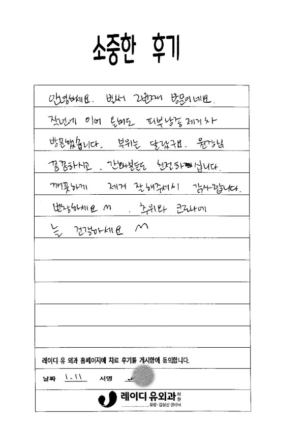 피부혹클리닉 이00님께서 작성해 주신 피지낭종 수술 후기입니다. 페이지 정보 작성자 레이디유 댓글 0건 조회211회 작성일 21-01-15 14:13 . 목록 이전글최00님께서 작성해 주신 유방초음파 검사 후기입니다. 21.01.15 다음글윤00님께서 작성해 주신 유방초음파 검사 후기입니다. 21.01.15